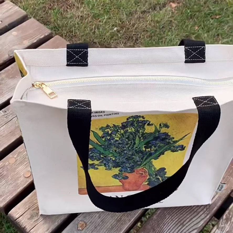 Vincent Van Gogh Dutch Post-Impressionist Painter "Vase with Irises Against a Yellow Background , 1889-1890" Aesthetic Canvas Art Tote Bag with Zip Closure and Inner Zipped Pocket